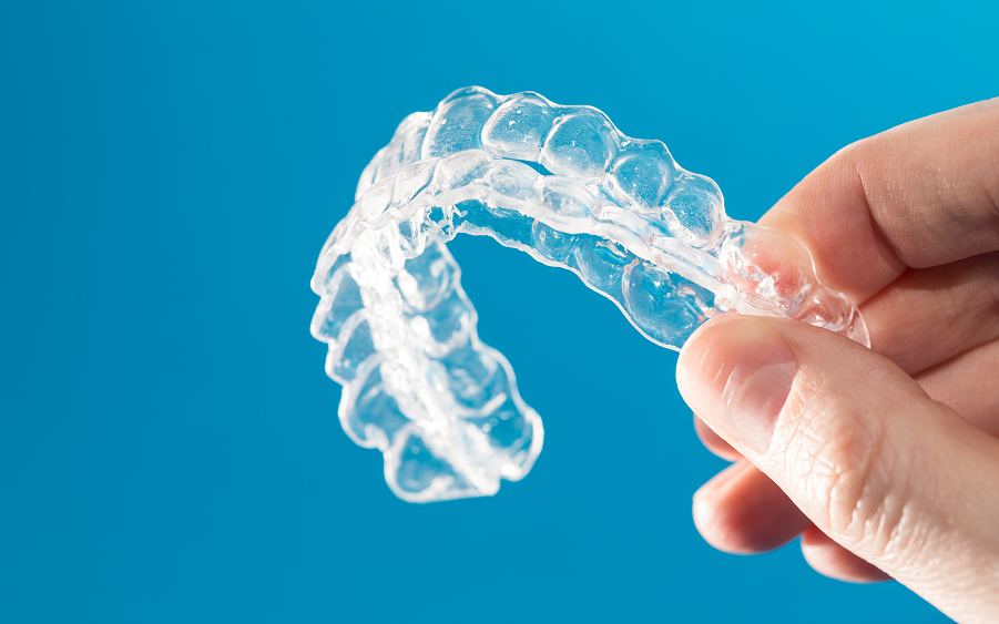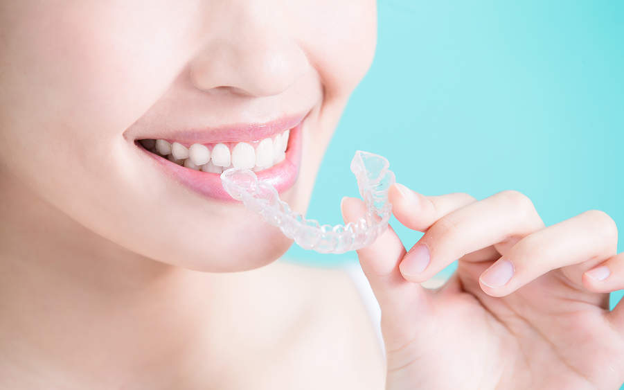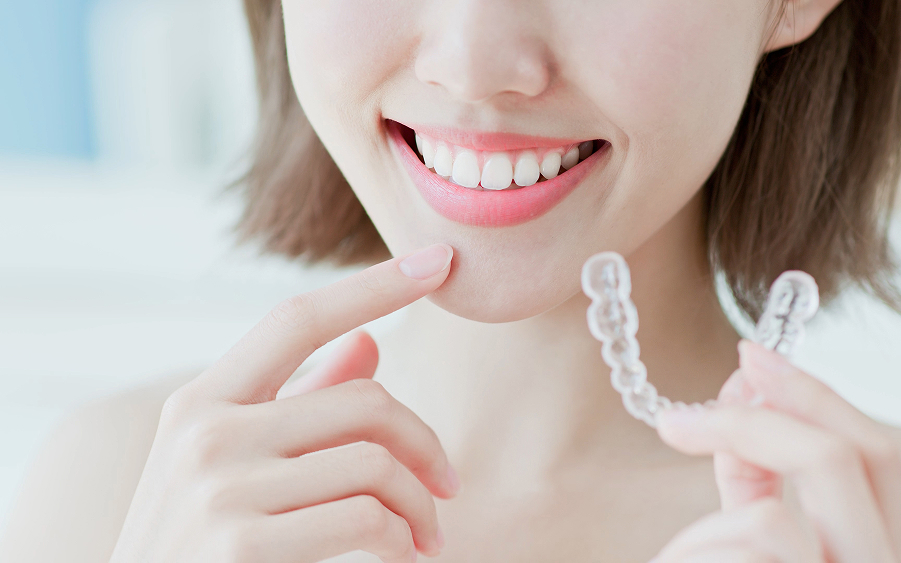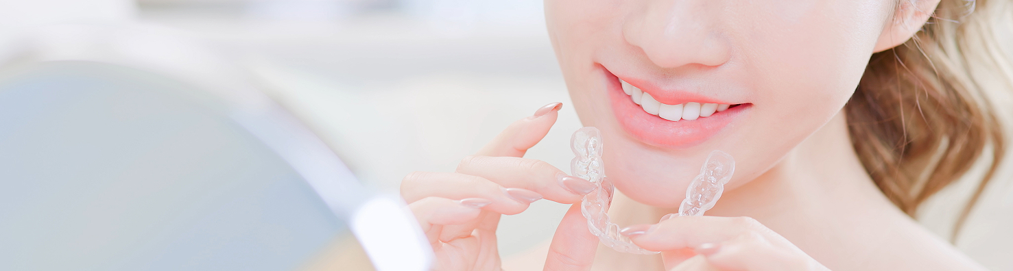 当院では、マウスピース型矯正装置を用いた治療を行っています。無色透明の薄い素材で作られたマウスピースを、段階に合わせてご自身で付け替えながら歯を動かしていく治療方法です。目立ちにくいので周囲に気づかれにくく、また食事や歯磨きの際には取り外せるので、衛生的な状態を保ちやすいことがメリットです。